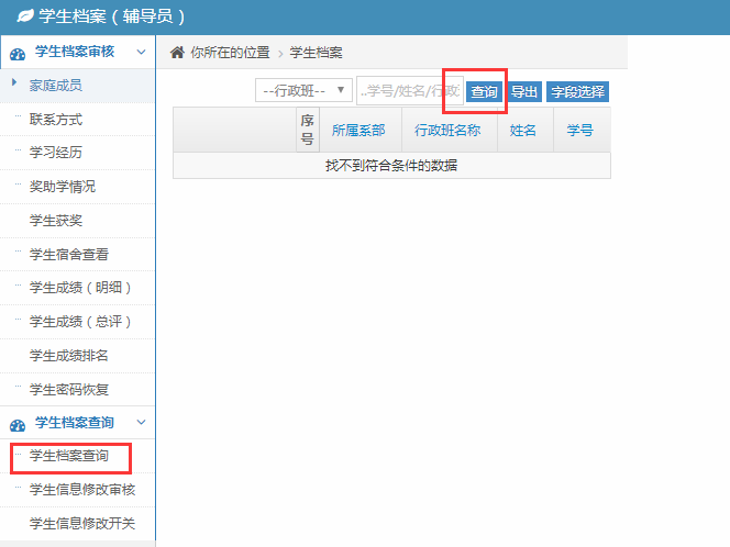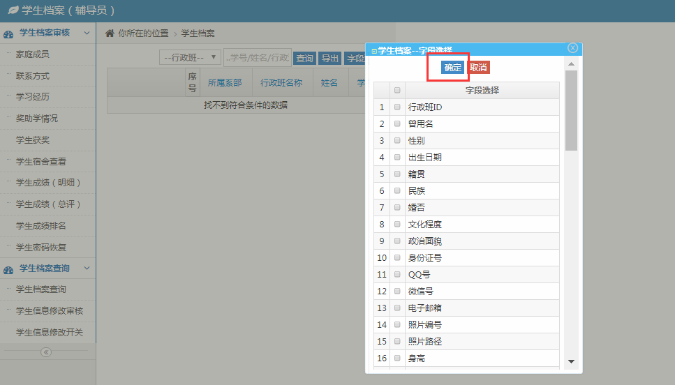 选择某个行政班或者输入所带年级个别学生学号或姓名,点击查询,出来的名单就是本人所带的学生信息。可选字段有62个,勾选想要导出的字段,点击确定后再点击导出即可。