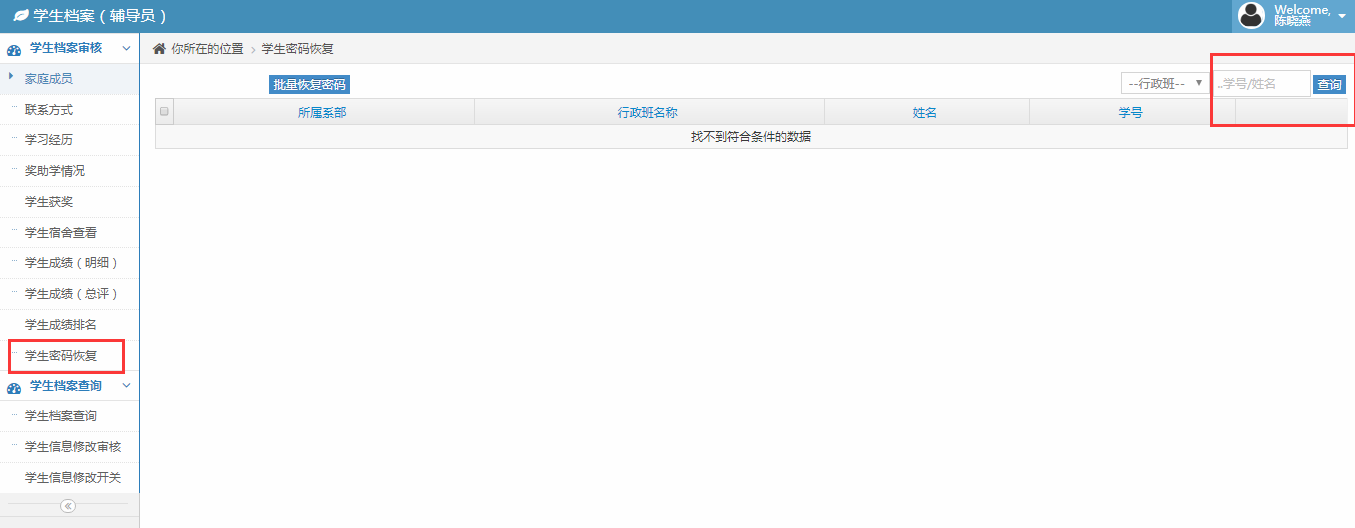 输入所带年级学生学号或姓名,点击查询,搜索出学生,选中学生,点击右侧“密码恢复”按钮即可,恢复密码为 学号+a。
